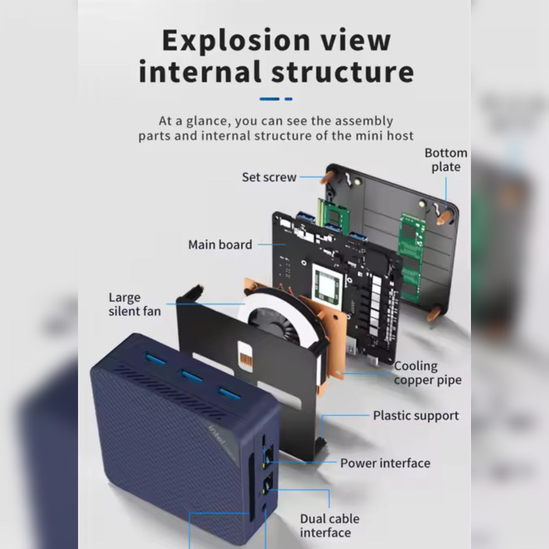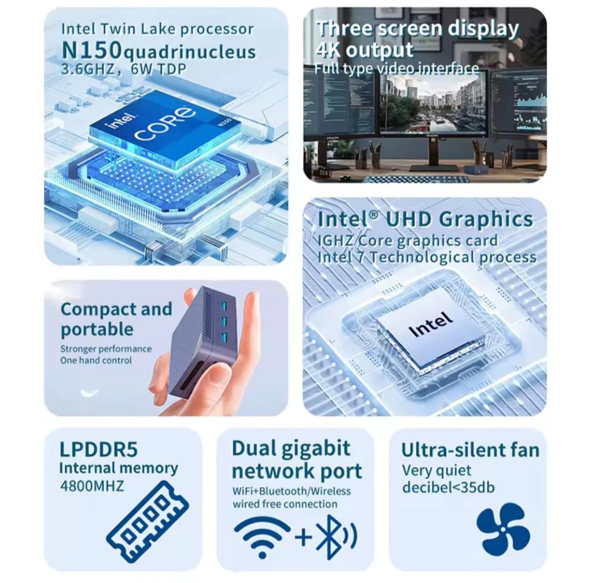 -Intel N150 - 4 núcleos, 4 subprocesos | 12 GB de RAM D5 | Salida 4K para 3 pantallas | Puerto de red Gigabit dual