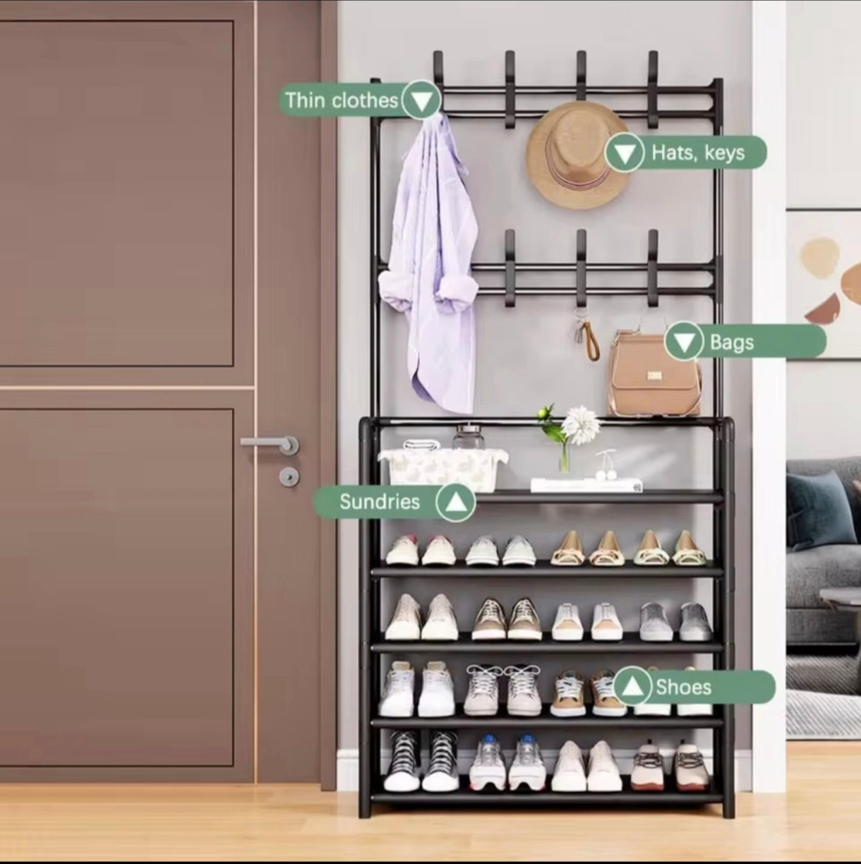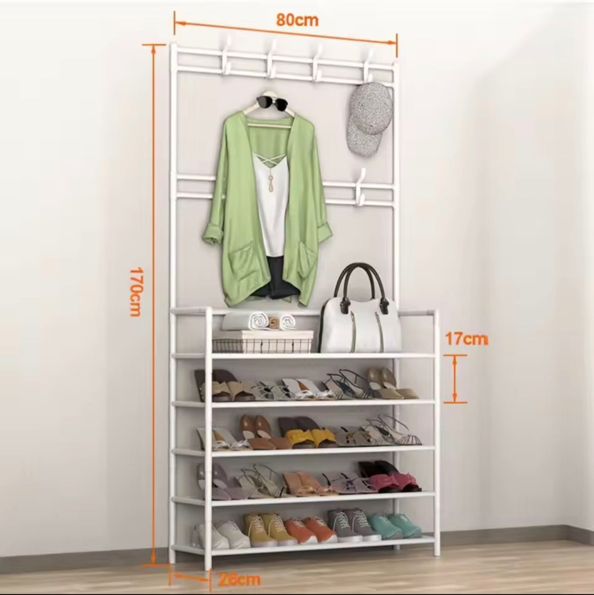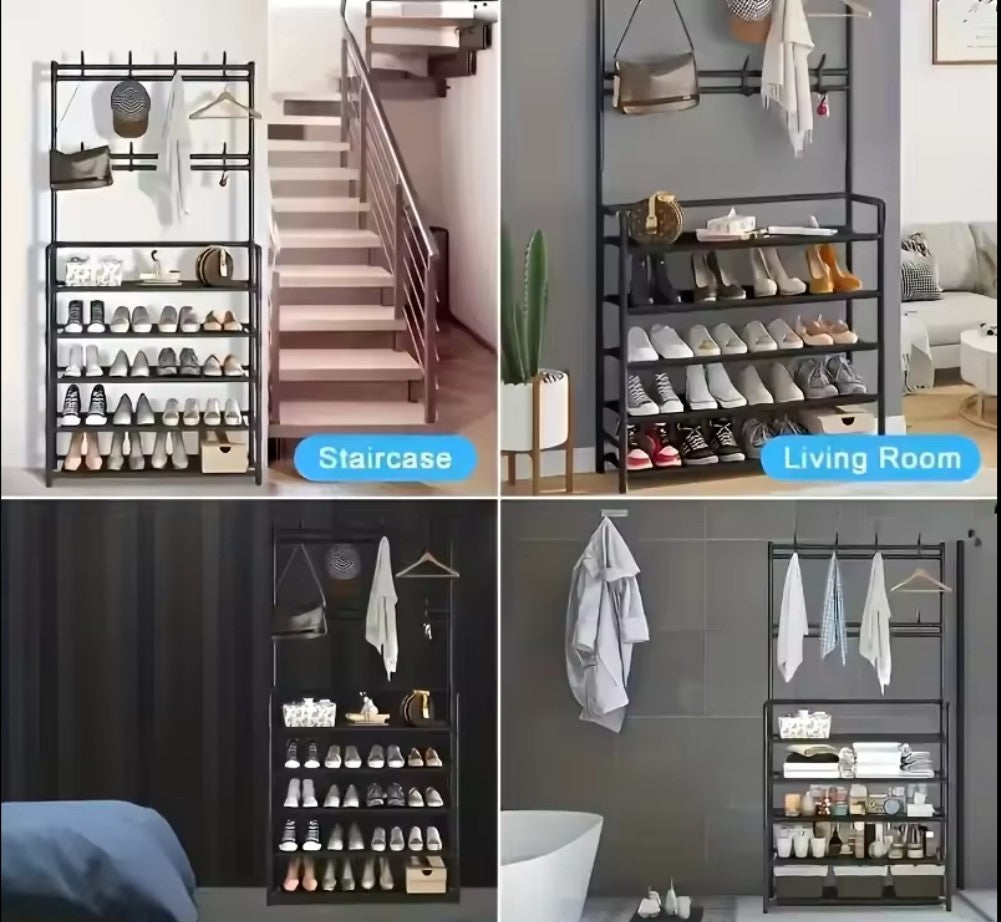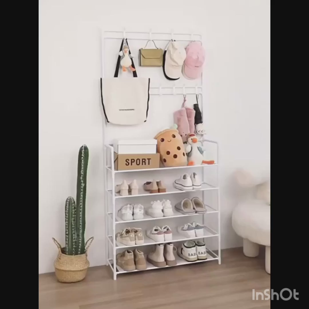 Este perchero y zapatero independiente tiene 8 ganchos en la parte superior y 5 niveles de estantes para zapatos, bolsos, bufandas, cajas, o cualquier cosa que necesite. . Es una solución ideal al problema de organizar el espacio.