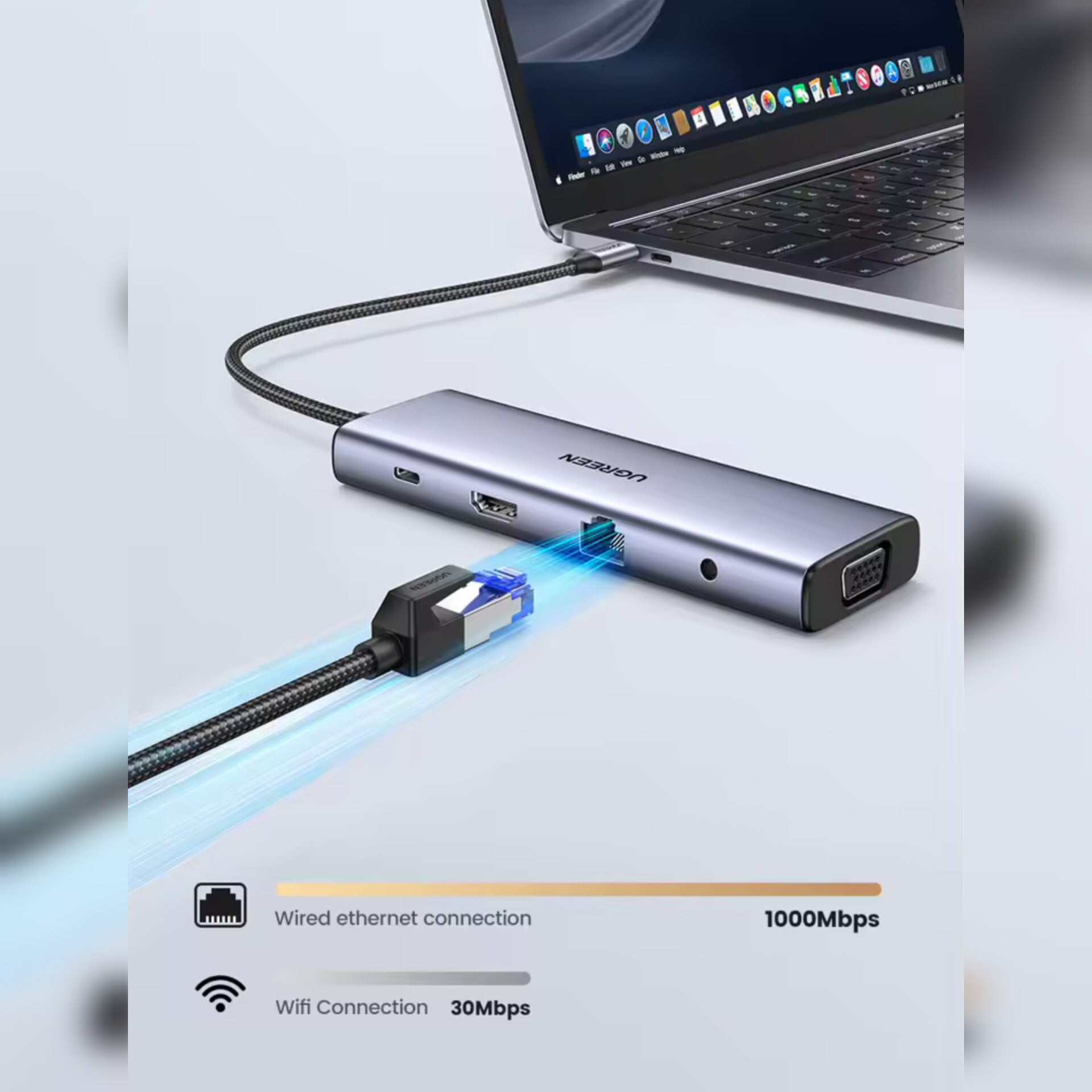 Ugreen estación de acoplamiento USB-C concentrador 10 en 1: HDMI 4K, VGA, Ethernet de 1 Gbps, PD de 100 W, 3 puertos USB 3.0, ranura para tarjeta SD/TF y audio de 3,5 mm